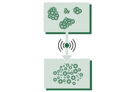 Le liquide essaie de suivre la fréquence mais ne parvient pas à le faire après une certaine fréquence. Les forces sont levées. Cela conduit finalement à une implosion de petites bulles ultrafines et au fait que les molécules se détachent les unes des autres et de la surface sous forme de nébuleuses fines, submicroniques et même nanométriques.